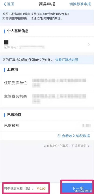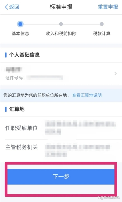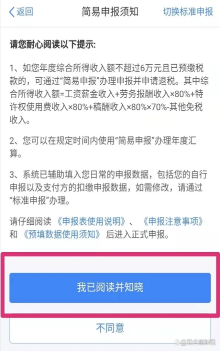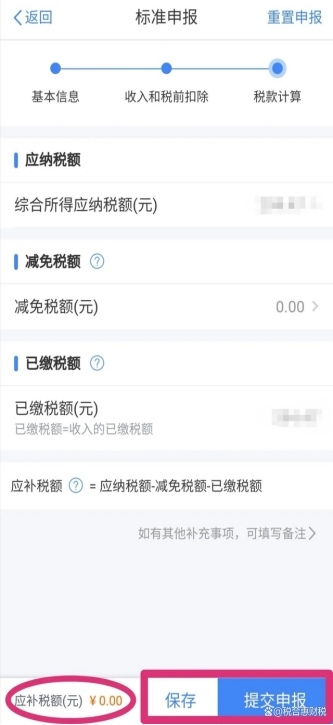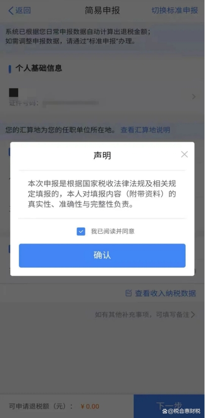 ③填报或者核定“费用”、“收入”、“税前扣除和免税收入”等项目——接着点击“下一步”——系统计算并显示您的“应退税额”或“应补税额”——在确认无误后可点击“提交申报”——勾选“我已阅读并同意”——点击“确认”,即可完成标准申报操作。