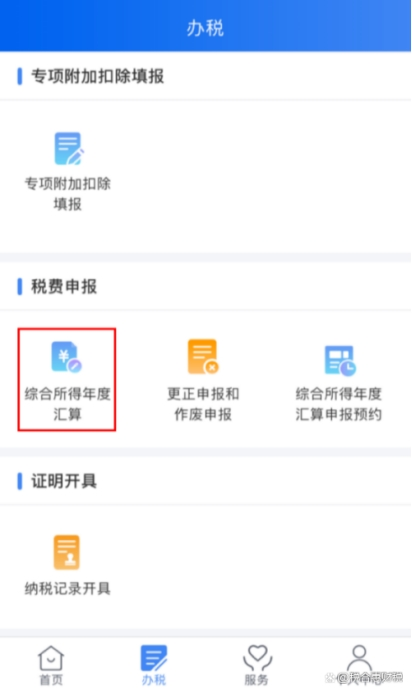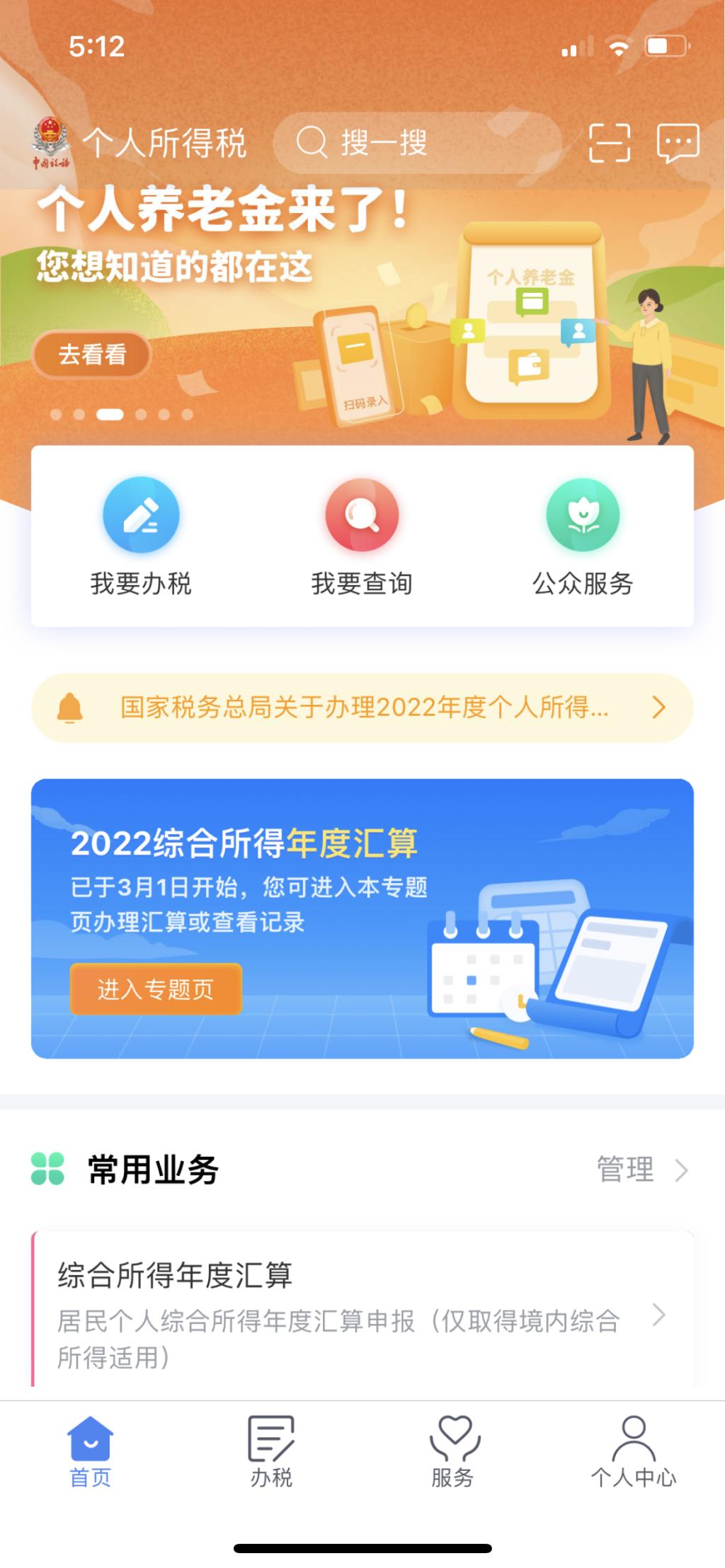 ①登录个人所得税APP,通过下方“办税-综合所得年度汇算”或者“我要办税”或者点击“2022综合所得年度汇算”——“开始申报”发起简易申报。